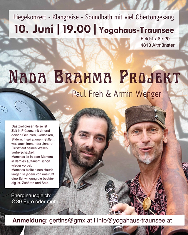 Liegekonzert mit Paul Freh & Armin Wenger9. Februar 2026/in Konzerte Yogahaus-Traunsee Paul Freh & Armin Wenger/von christine kienesberger Liegekonzert – Klangreise – Soundbath mit viel ObertongesangNADA BRAHMA Projekt 2026/06/10 at 7:0019:00 — 20:30 (1h 30′) Yogahaus-Traunsee Paul Freh & Armin Wenger iCal Event https://www.yogahaus-traunsee.at/wp-content/uploads/2015/09/yogahaus_03.png 0 0 christine kienesberger https://www.yogahaus-traunsee.at/wp-content/uploads/2015/09/yogahaus_03.png christine kienesberger2026-02-09 21:36:462026-02-09 21:49:51Liegekonzert mit Paul Freh & Armin Wenger